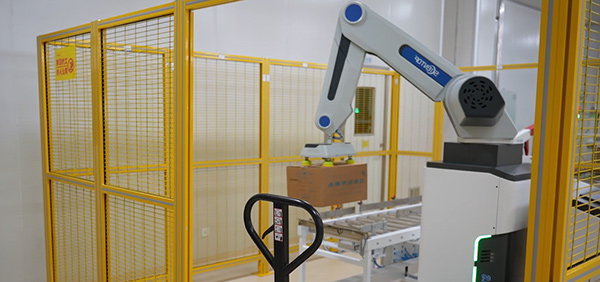 該工位將前端輸送來的已封好紙箱輸送至指定位置,自動碼垛機(jī)器人通過吸盤將紙箱按規(guī)定方式整齊碼放在托盤上;根據(jù)包裝方式、尺寸、負(fù)載等要求不同可定制抓取方式及承載能力。